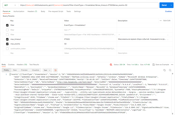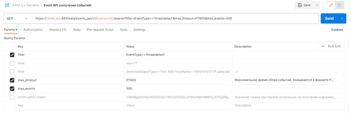 Синтаксис: GET "<URL-адрес сервера с компонентом Central Node>:<порт, по умолчанию 443>/kata/events_api/v1/<идентификатор external_system_id>/events=?filter=<фильтр для событий>&max_timeout=<максимальное время сбора событий>&max_events=<максимальное количество событий>&continuation_token=<значение токена, полученное при первом запросе>"