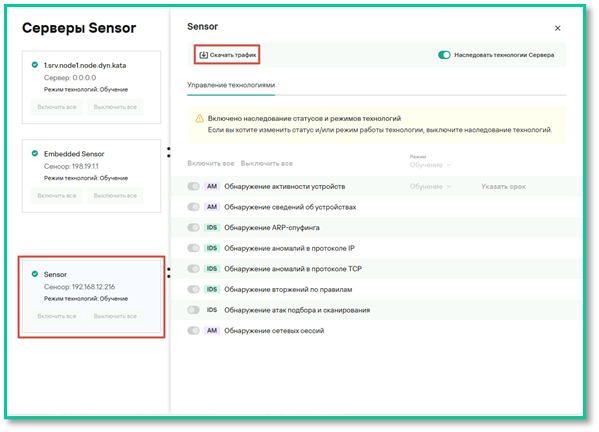 2. Перейдите: Серверы Sensor → Выбрать Sensor → Скачать трафик.