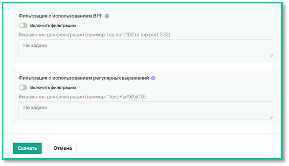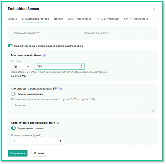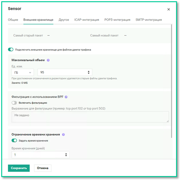 - Для записи и хранения сырого трафика требуется лицензия NDR или KATA/NDR.
