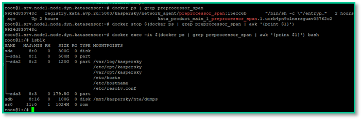 docker ps | grep preprocessor_span5. Убедитесь, что напротив имени подключенного диска в столбце MOUNTPOINTS отображается значение /mnt/kaspersky/nta/dumps.