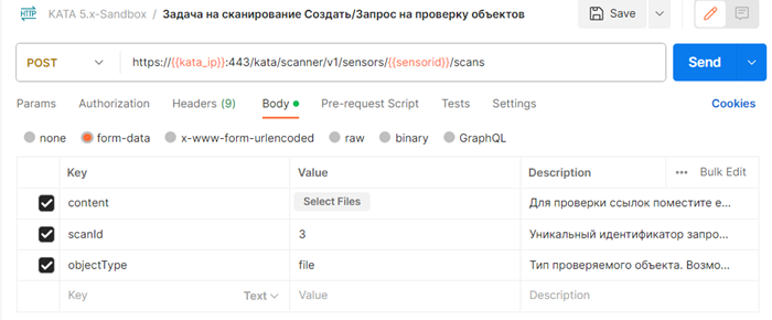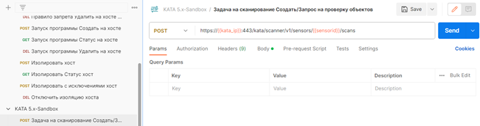 Специалистами АО «Лаборатория Касперского» подготовлены коллекции запросов для взаимодействия с KATA/KEDR через приложение для автоматизации работы с API запросами -  POSTMAN  и размещены по следующему адресу: https://www.postman.com/kl-ru-presales/workspace/kaspersky-products-apis-ru/documentation/8104472-2e3ebb80-3c2b-4b54-9939-043e57987b2b