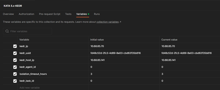 Откройте окно коллекции, перейдите во вкладку Variables, настройте переменные kedr_ip Они доступны для всех параметров в коллекции.