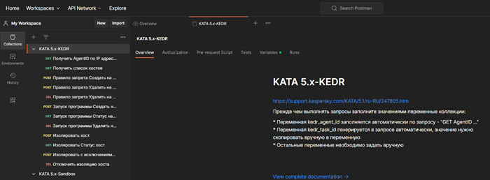 Экспортируйте коллекции из доступной коллекции Kaspersky Products APIs (RU).