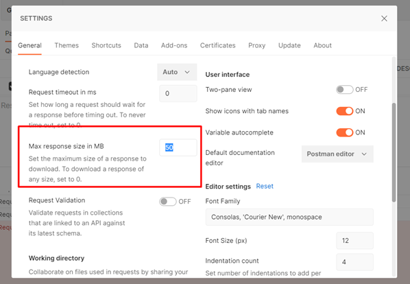 Нажмите «Ctrl+,», откроется меню настроек. В параметре «Maximum response size» введите значение от 50 до 200 MB. (Минимально 50). Закройте окно.