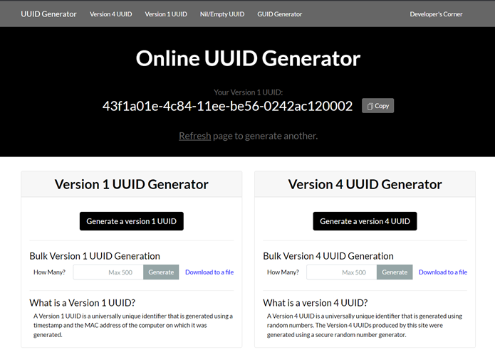 Для создания UUID необходимо перейти на сайт https://www.uuidgenerator.net/version1 и нажать на кнопку «Generate a version 1 UUID» будет сформирован UUID.