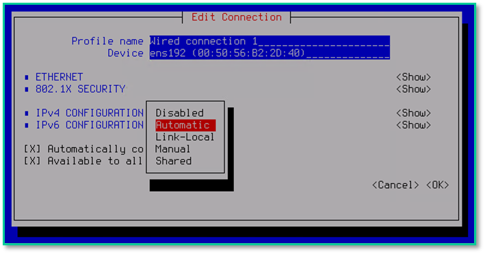 Настройка IPv4 — выбор «Automatic» (DHCP) или статик, после подтверждение настройки — кнопка «OK»