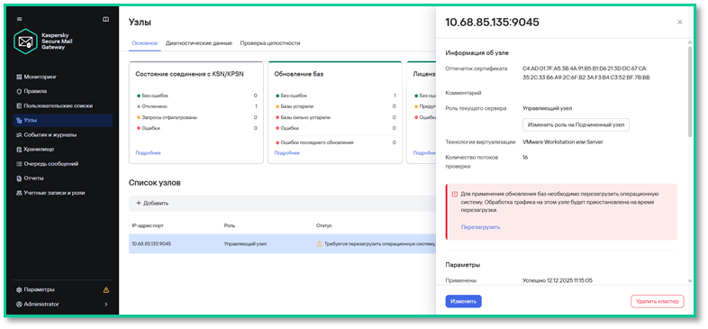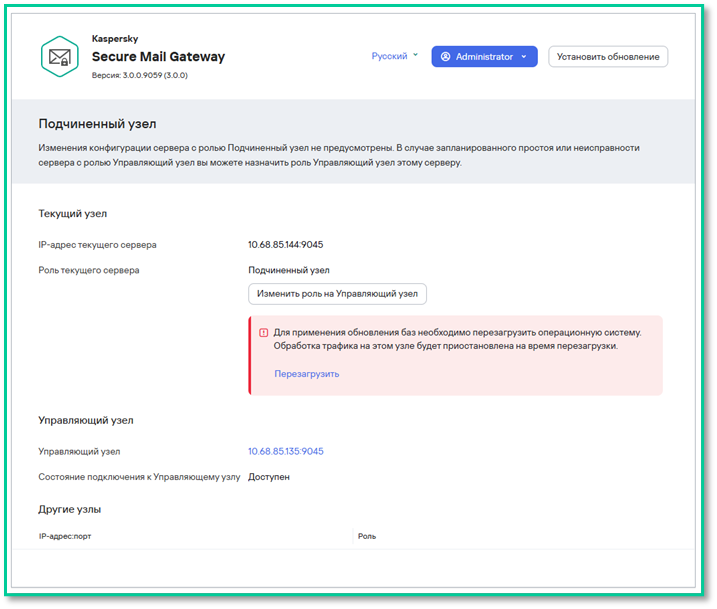 Перезагрузка Управляющего узла — «Узлы → Перезагрузить»