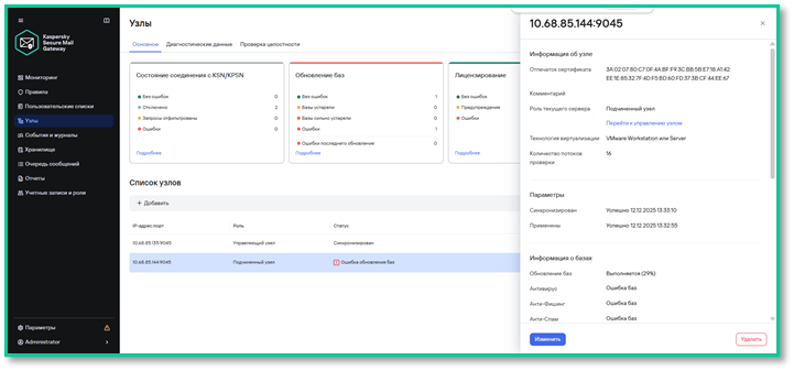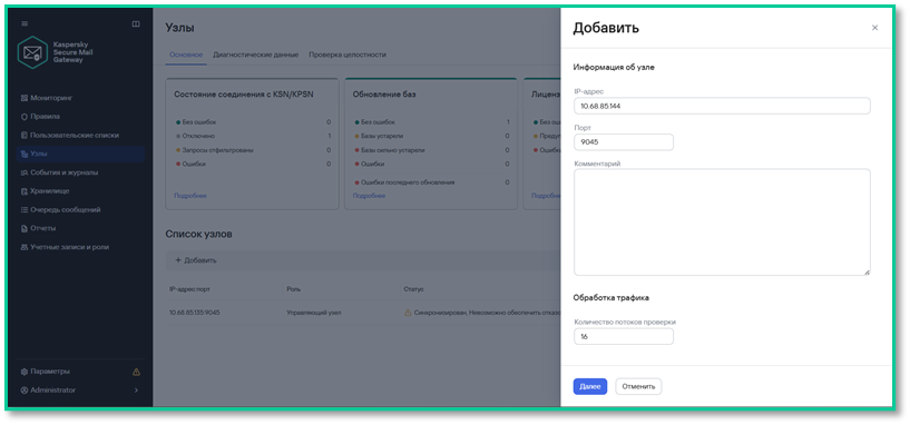 Чтобы программа могла выполнять балансировку без сбоев, нужно добавить в кластер хотя бы один «подчинённый узел». Для этого нужно создать ещё одну виртуальную машину и установить на неё Kaspersky Secure Mail Gateway, как и в предыдущих шагах.