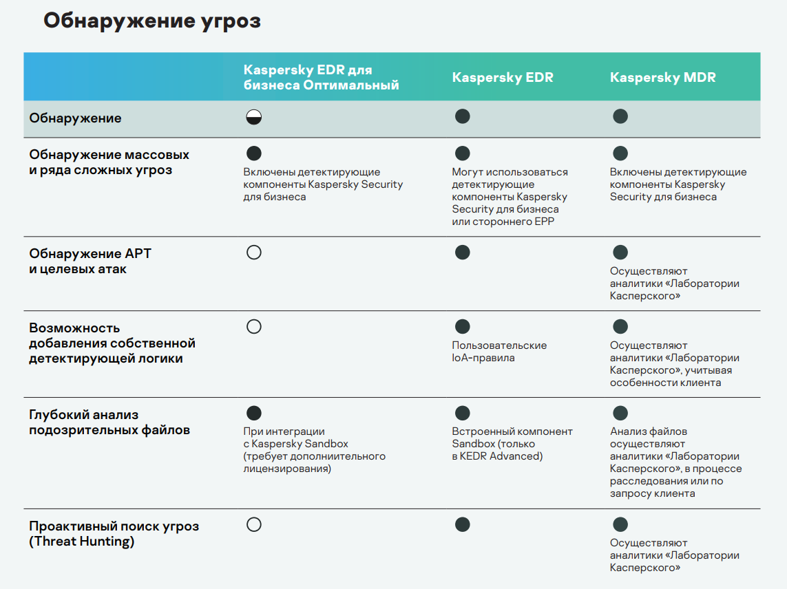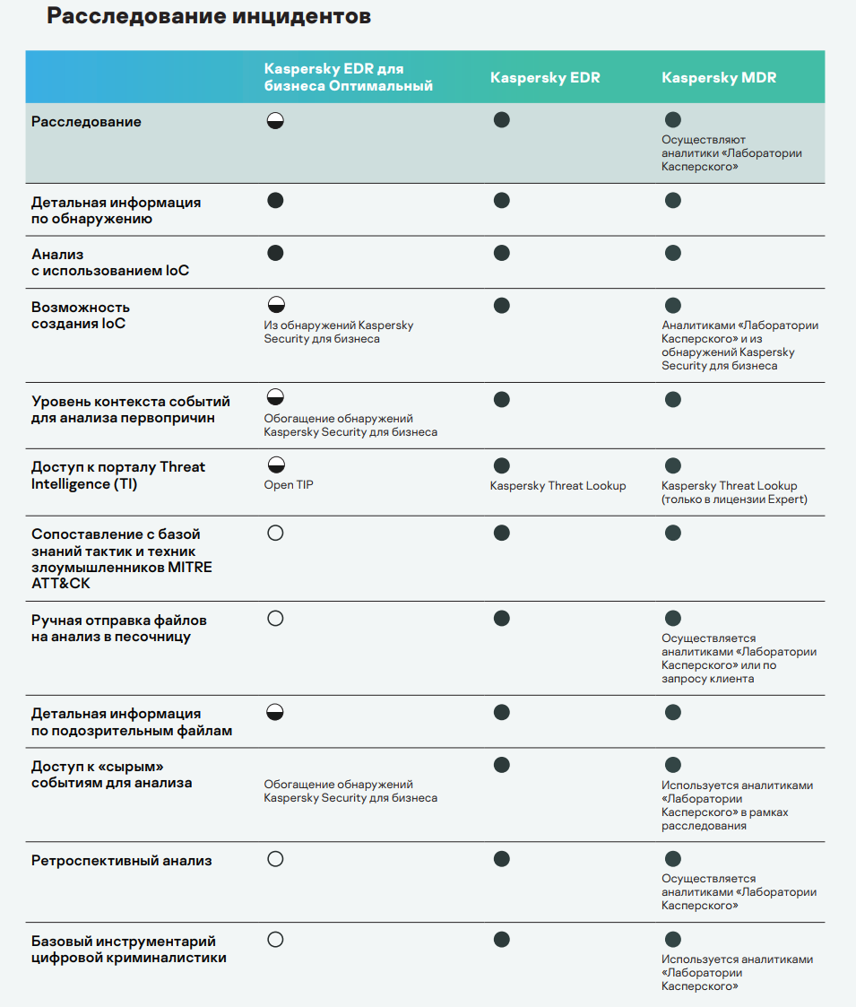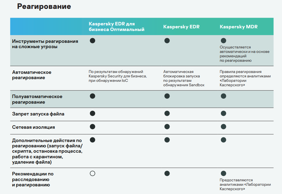 Kaspersky EDR предоставляет экспертные возможности противодействия сложным угрозам, но в то же время требует высокой квалификации и активного участия от сотрудников ИБ.