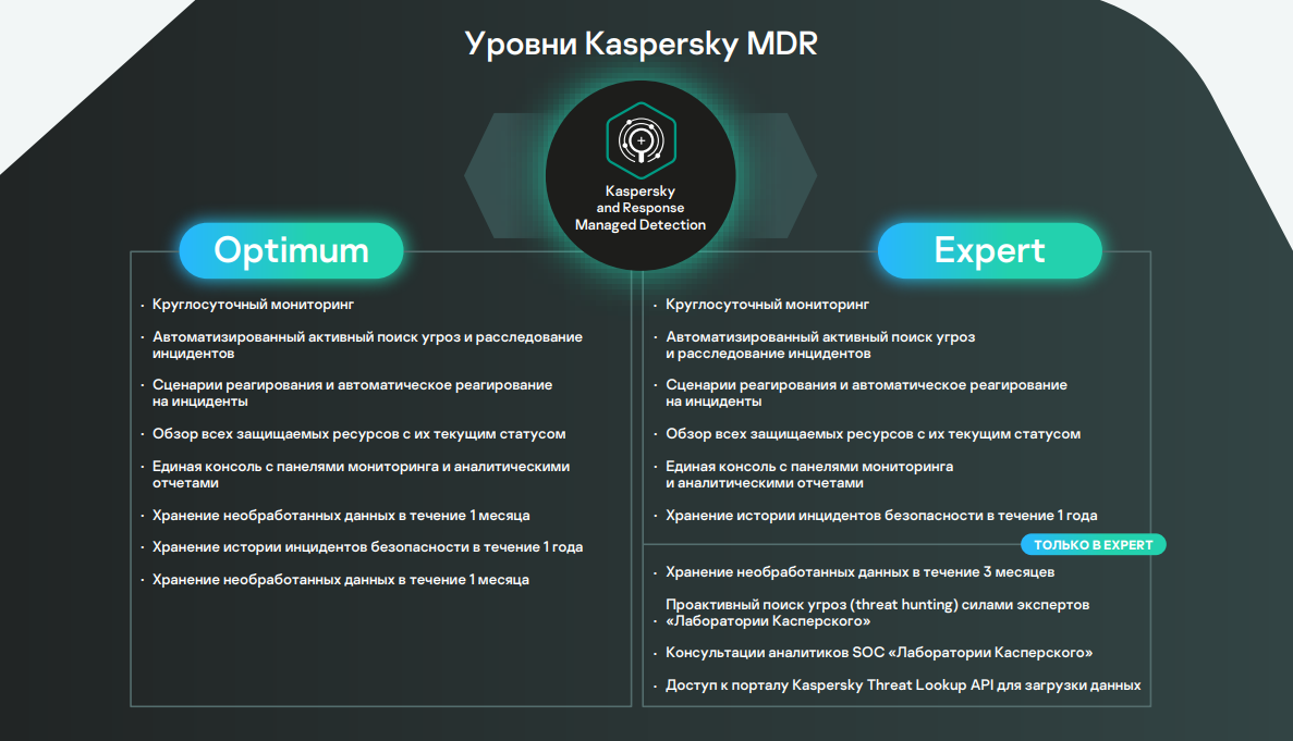 Kaspersky MDR Expert включает в себя все возможности Kaspersky MDR Optimum, а также предоставляет дополнительную гибкость для опытных ИБ-команд. Более крупные организации с развитой ИБ-экспертизой могут передать процессы классификации и расследования инцидентов в «Лабораторию Касперского» и направить свои ресурсы на решение более важных ИБ-задач.