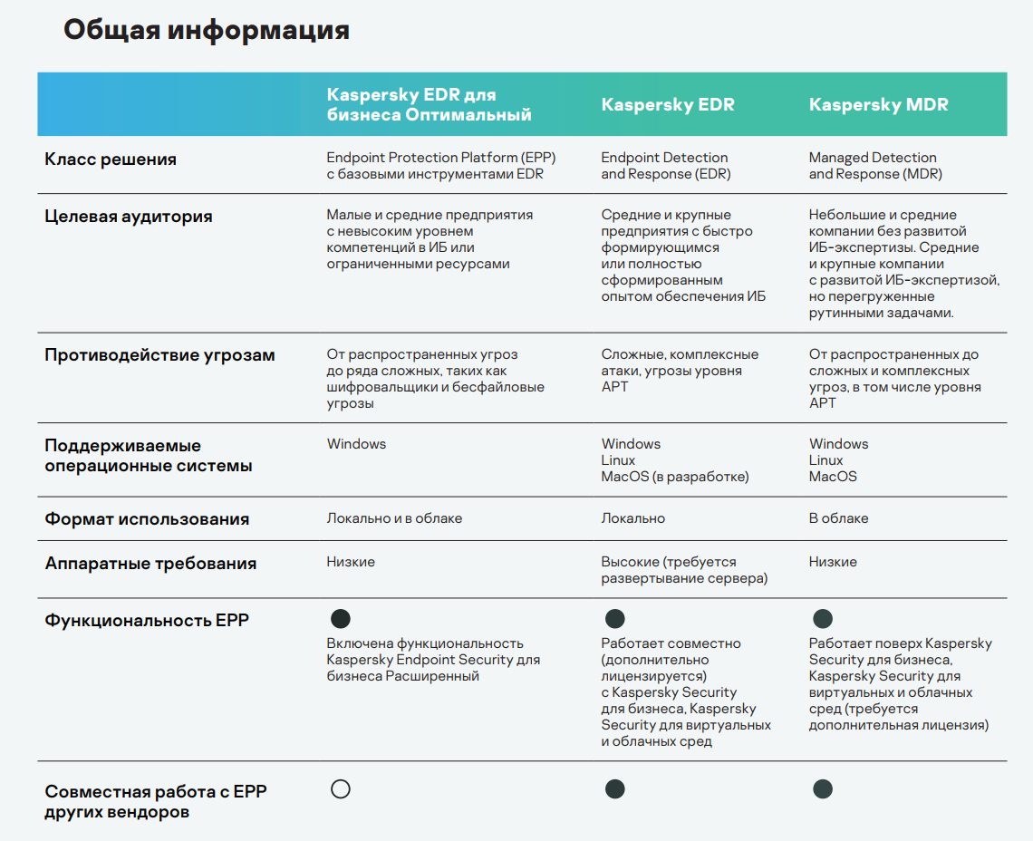 Пимечение: данная статья призвана показать, как наши ключевые решения по защите от киберугроз разного уровня сложности отвечают потребностям компаний, которые имеют различную ИБэкспертизу, и провести их детальное функциональное сравнение.
