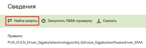 - Выбрав необходимое правило в разделе Пользовательские правила --> YARA и нажав Найти алерты