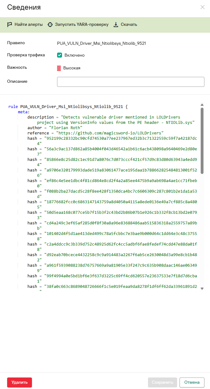 После добавления правило отобразиться в новой записью в разделе Пользовательские правила --> YARA