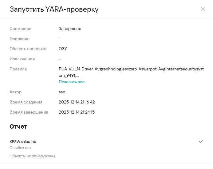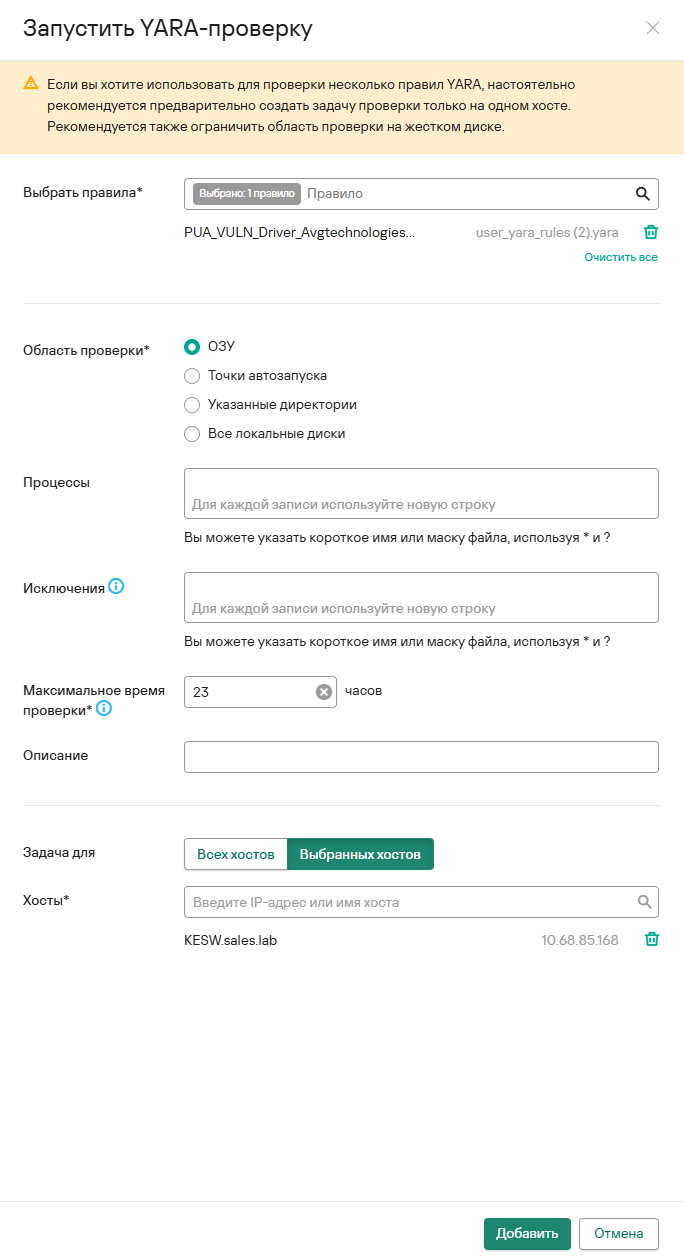 В этом случае создается задача для проверки хостов по выбранным правилам YARA.