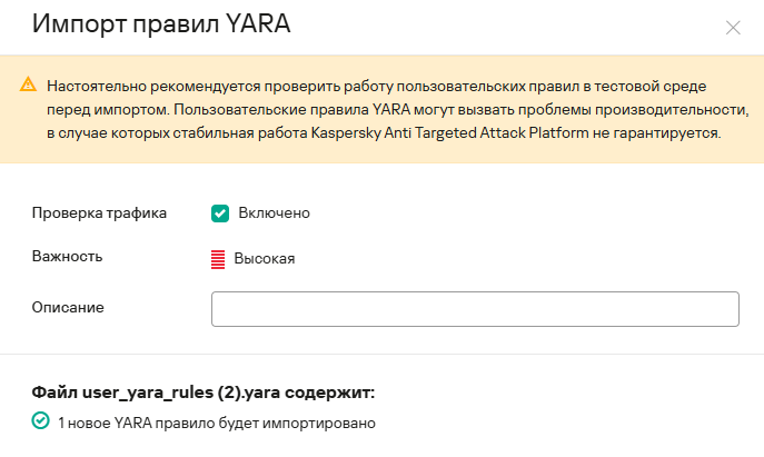 Вы можете загружать собственные YARA правила в KATA для проверки файлов и объектов, поступающих на Central Node, и для проверки хостов с компонентом Endpoint Agent.