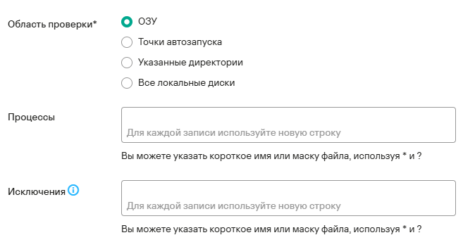 - ОЗУ - при необходимости проверить процессы, запущенные на момент выполнения задачи. Укажите необходимые короткие имена процессов или маску файлов, которые хотите проверить, а также исключения проверки при необходимости. Можно использовать маски * и ?;