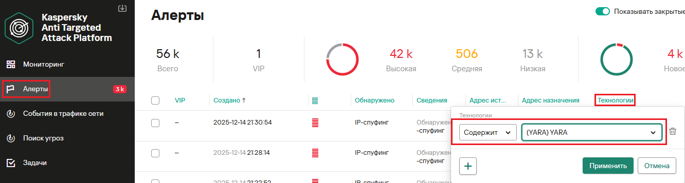 - Перейти в раздел Алерты и задать соответствующий фильтр на столбец Технологии