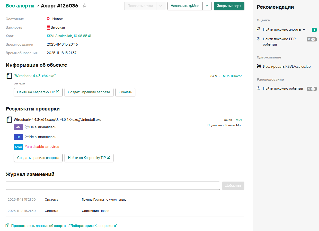 Также можно найти алерты связанные с выбранным правилом и создать задачу проверки по данному YARA-правилу нажав Запустить YARA-проверку