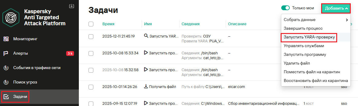 При необходимости вы можете проверять хосты из раздела Endpoint Agent с помощью правил YARA. Для этого требуется создать задачу Запустить YARA-проверку. Вы можете создать задачу следующими способами:
