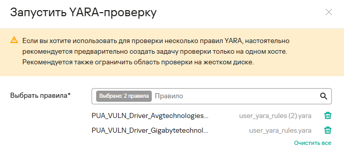 В этом случае при создании задачи вам потребуется выбрать правила YARA, с помощью которых вы хотите проверить хосты;