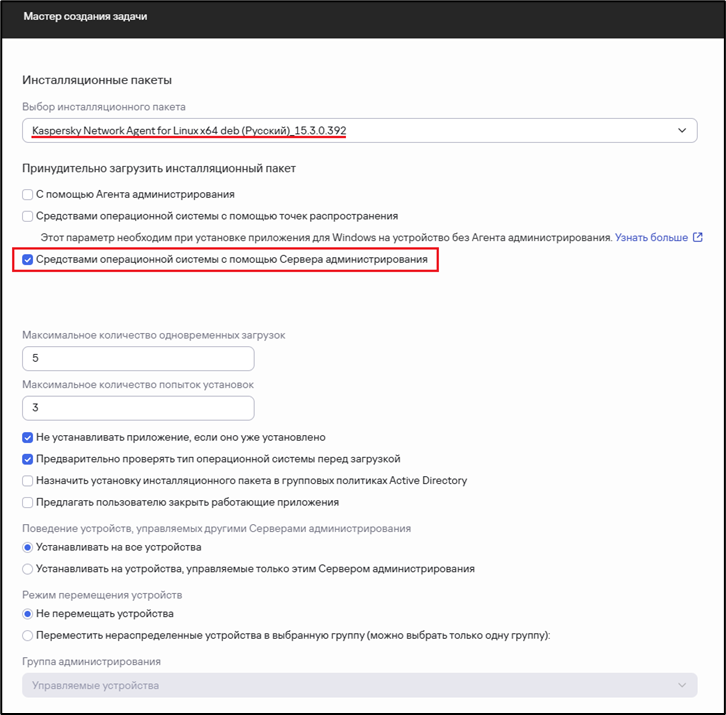 Затем указать из выпадающего списка инсталляционный пакет агента администрирования и выбрать установку Средствами операционной системы с помощью Сервера администрирования. Остальные параметры можно оставить по умолчанию