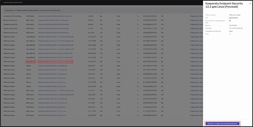 Далее в этом же списке находим Kaspersky Endpoint Security для Linux. Аналогично нажать на него и выбирать Загрузить и создать инсталляционный пакет