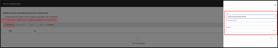 На следующем шаге необходимо выбрать Учетная запись требуется (Агент администрирования не используется), нажать Добавить и указать учётную запись пользователя или SSH cсертифика