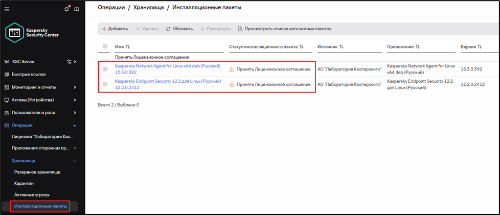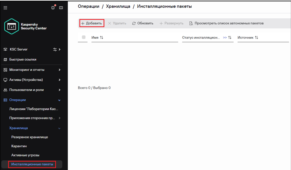 В веб-консоли KSC перейти в раздел Операции Хранилища Инсталляционные пакеты и нажать Добавить