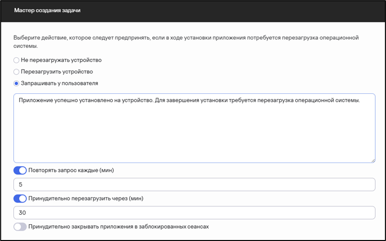 Далее выбрать действие, которое следует предпринять, если в ходе установки приложения потребуется перезагрузка операционной системы (можно оставить по умолчанию)