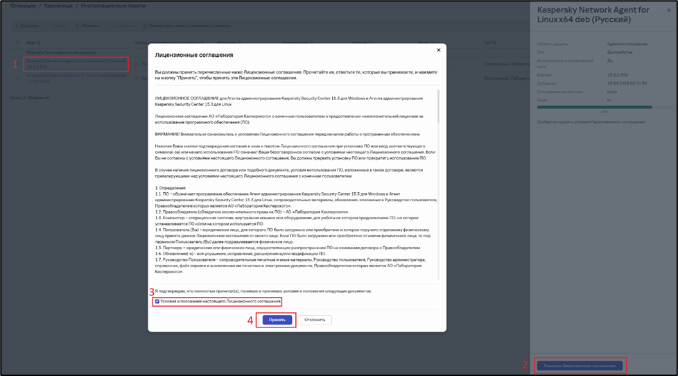 После этого вернуться в раздел Инсталляционные пакеты. Для загружаемых инсталляционных пакетов необходимо принять лицензионное соглашени