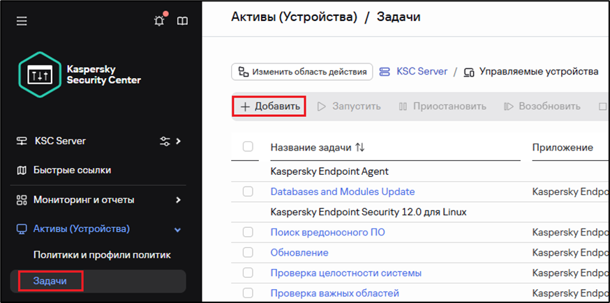 После успешной установки KESL, необходимо его необходимо активировать лицензией. Для активации в разделе Активы (Устройства) / Задачи выбрать Добавить