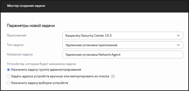 Удаленная установка KESL также производится через задачу удаленной установки. В разделе Активы (Устройства) / Задачи выбрать Добавить