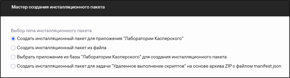 Выбираем «Создать инсталляционный пакет для приложения Лаборатории Касперского». При необходимости можно добавить инсталляционный пакет из файла, который был заранее скачан с сайта Лаборатории Касперского, для этого необходимо выбрать «Создать инсталляционный пакет из файла»