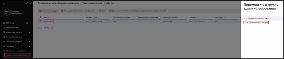 Перед тем как начать установку необходимо перенести обнаруженные Сервером администрирования устройства в раздел управляемые устройства. Для этого необходимо перейти в раздел Обнаружение устройств и развертывание / Нераспределенные устройства и выбрать необходимые для перемещения устройства, которые были обнаружены KSC, нажать Переместить в группу и выбрать необходимую группу для перемещения (по умолчанию создана корневая группа Управляемые устройства, в которую можно добавлять вложенные группы, формируя иерархию групп администрирования)