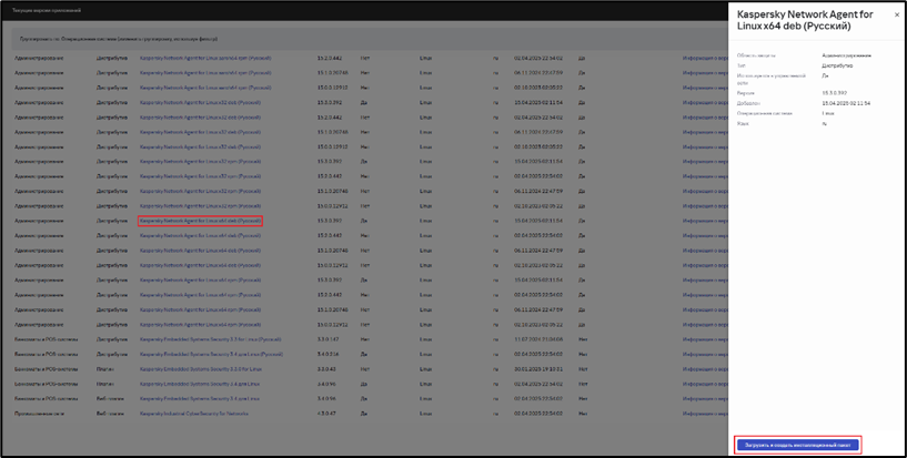 Выбираем инсталляционный пакет агента администрирования в соответствии с типом ОС Linux (в данном примере устанавливается DEB based версия) и нажимаем на него, затем выбираем Загрузить и создать инсталляционный пакет